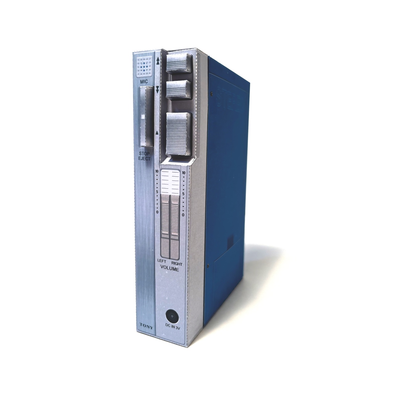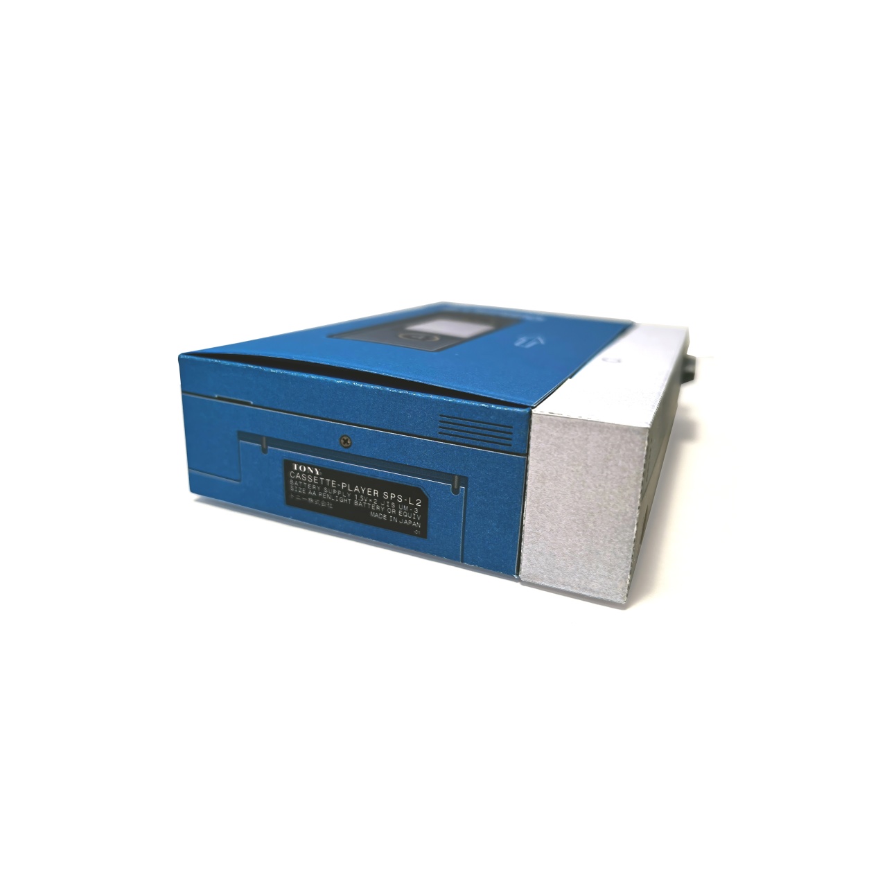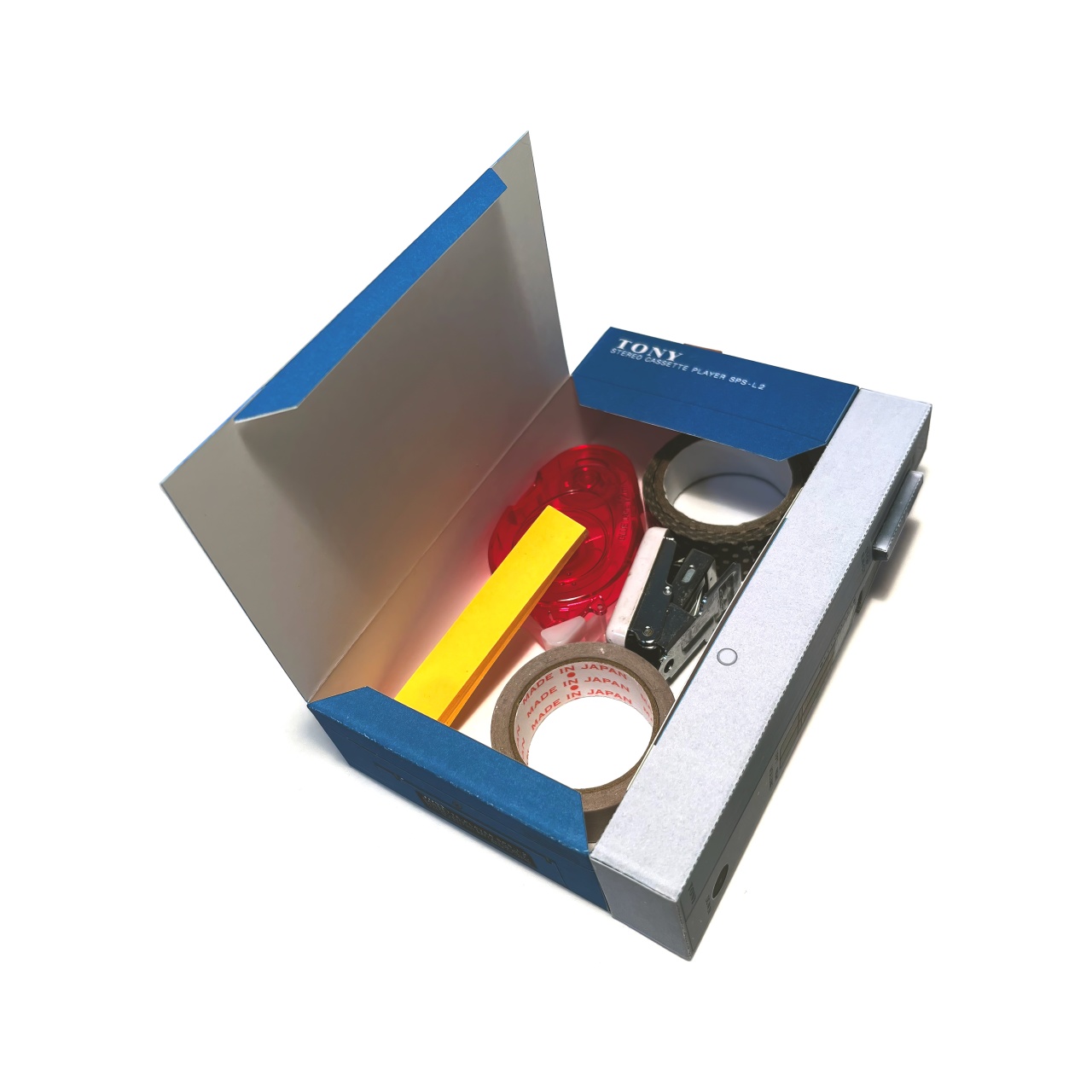 初代ウォークマンを参考にした小物入れ箱です。ロゴは意図的に変えています。組立易さを優先したので、本物より形状が簡易なモデルになっています。カセットテープを取り出すように、カバーを開閉することができ、中に小物の収納することができます。カバーの差込み部分はロックがかかる構造になっています。