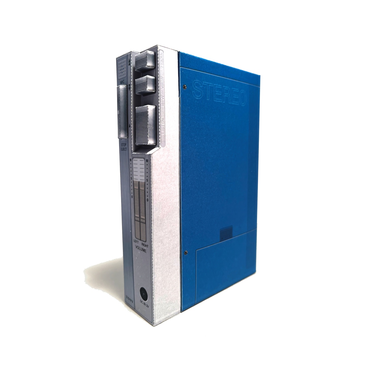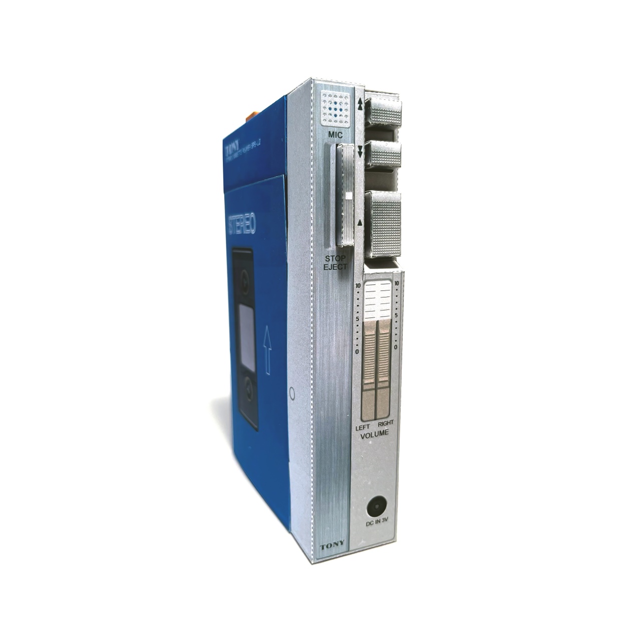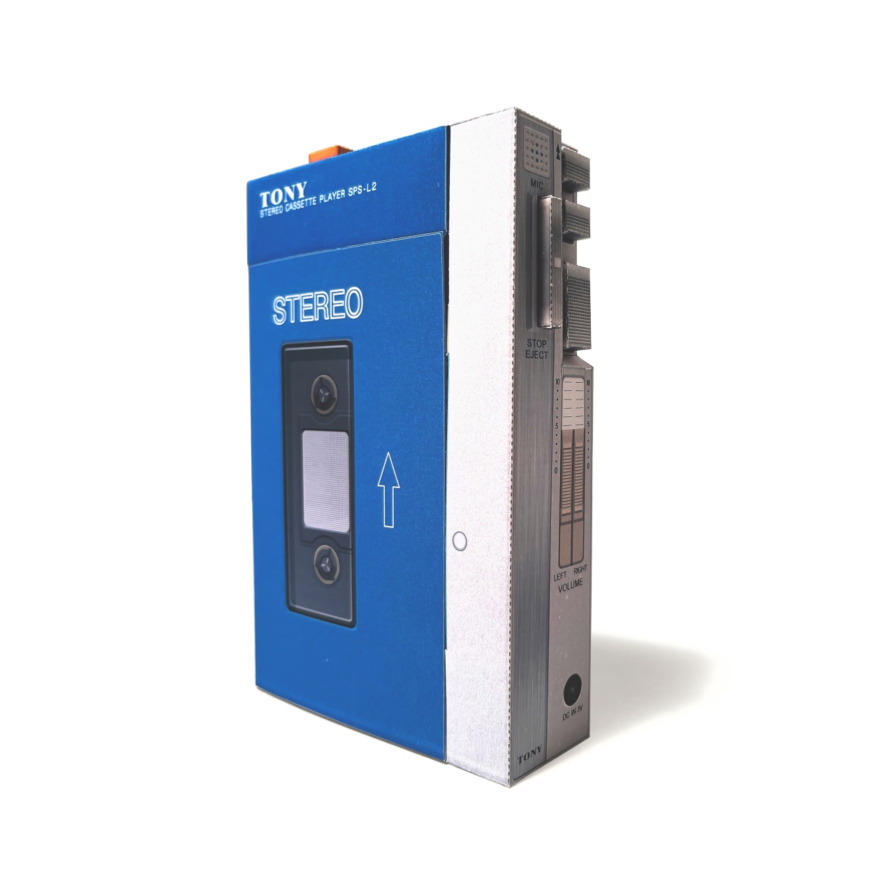 初代ウォークマンを参考にした小物入れ箱です。ロゴは意図的に変えています。組立易さを優先したので、本物より形状が簡易なモデルになっています。カセットテープを取り出すように、カバーを開閉することができ、中に小物の収納することができます。カバーの差込み部分はロックがかかる構造になっています。